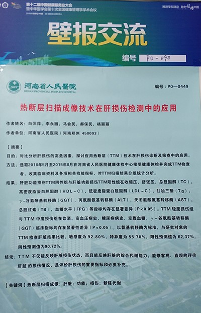 大會壁報展示了河南省人民醫(yī)院的《熱斷層掃描成像技術(shù)在肝損傷檢測中的應(yīng)用》學術(shù)論文,文章對比分析了肝損傷的高危因素,探討應(yīng)用熱斷層(TTM)技術(shù)在肝損傷診斷及篩查中的應(yīng)用,結(jié)論表明TTM不僅能反應(yīng)肝損傷狀態(tài),而且能反應(yīng)肝臟的綜合代謝能力,能夠客觀、直觀的評價肝臟的損傷情況,是評價肝損傷的重要指標和必要補充。